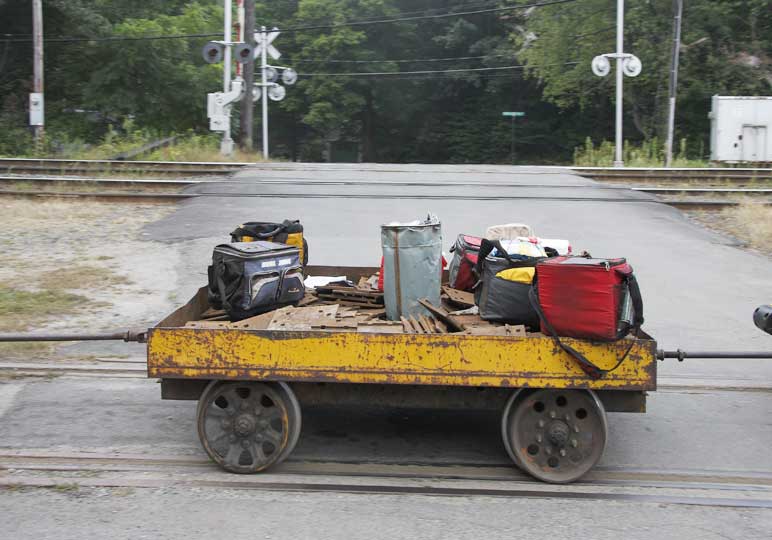 Lunch Cart: There's a track crew upgrading the rails between Greenfield and Mechanicsville. I caught this cart carrying tie plates, spike buckets and lunch bags as it was being towed across the road at the Shelburne Falls Trolley Museum where the equipment is being stored each night. |