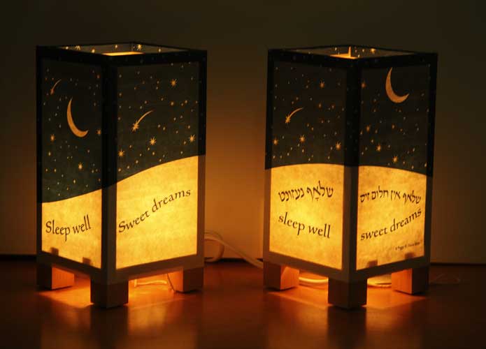 Moon & Stars Night Lights What could be a better gift for a child than this comforting night light? A nightly reminder of a far-away grandparent's love, an aunt or uncle's affection, calming nighttime fears with a whisper of "sweet dreams" when it is turned on. Or perhaps it is a grandparent who would love to receive one from a grandchild, to make it easier to get up during the night. A natural wood frame supports the custom-printed Moon & Stars design by Peggy Davis.